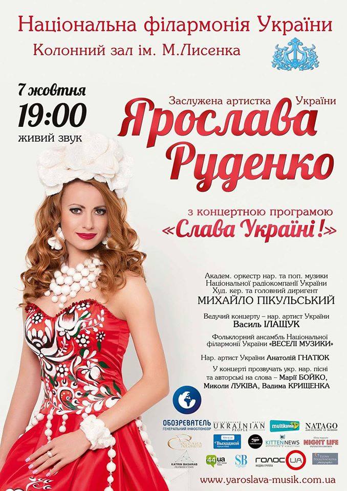 7 октября, в 19:00 в Колонном зале Национальной филармонии Украины состоится сольный концерт — заслуженной артистки Украины, солистки Национальной филармонии и ансамбля Вооруженных Сил Украины, Ярославы Руденко. В концерте примут участие: академический оркестр народной и популярной музыки Национальной радиокомпании Украины, Дирижер — Михаил Пикульский. Народный ансамбль Веселые музыканты. Народный артист Украины — Анатолий Гнатюк. Поэты: Мария Бойко, Николай Луков, Вадим Крищенко. Ведущий концерта, народный артист Украины — Василий Илащук. В концерте прозвучат украинские народные песни из разных регионов Украины. Этим певица хочет показать, что наша родная земля, наш народ — едины и неразделимы. А само название концерта ,, Слава Украине …