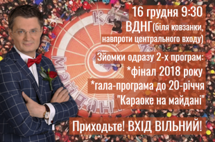 Осталось совсем немного времени до одного из самых ожидаемых событий украинского телевидения: 17 января 2019 года культовая телеигра Украины «Караоке на майдане» отметит юбилей – 20 лет на экране. А уже в это воскресенье, пройдут последние съемки «Караоке на майдані». Так что каждый может принять участие и посмотреть на съемочный процесс, а возможно и посчитать деньги участникам. Игорь Кондратюк приглашает всех желающих 16 декабря на съемку сразу двух финальных программ: 1) финальной программы года, в которой 5 лучших певцов 2018 года разыграют звание «Лучший народный певец Украины» и автомобиль от многолетнего партнера программы; 2) и съемка праздничной передачи, посвященной юбилею …