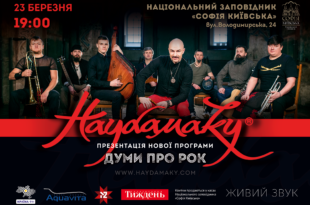 23 березня український рок-гурт «Гайдамаки» презентує нову акустичну програму «Думи про Рок». Присутніх очікує занурення у сучасну культуру оновленої козацької традиції: козак – це сучасний українець-воїн, мудрий та відважний, впевнений в собі та успішний. Всі присутні опиняться під дахом гайдамацького куреня. Роздуми гайдамаків про життя, віру та любов, вилиті у пісні — це сучасна музична візія легендарної козацької доби. Акустичне звучання додає містики, викликає незабутні емоції, примушує повірити в магію з найчистішим українським началом. Окрім традиційних для акустичної рок-музики інструментів, таких як: гітара, ударні, акустична бас-гітара та характерних для гурту труби та тромбону, слухач відкриє для себе магію перкусії (акустичних …