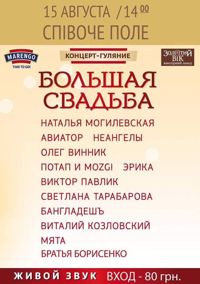 15 августа на Певчем поле пройдет самое яркое событие этого лета – «Большая Свадьба». Бренд MARENGO и Русское Радио приглашают всех любителей весело провести время на грандиозном концерте-гулянье. В этот день молодоженов и всех гостей будут поздравлять: Наталья Могилевская Виталий Козловский Неангелы Мята БангладешЪ Виктор Павлик Эрика Олег Винник Братья Борисенко Светлана Тарабарова Авиатор Потап и группа Mozgi, а также множество других всенародно любимых исполнителей. Артисты придут поздравить молодых и порадовать гостей мероприятия. Будет шумно, весело и музыкально! Места хватит всем! Свадьбу нужно отпраздновать так ярко, чтобы это запомнилось на всю жизнь!