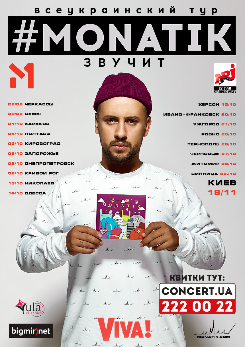 Самый масштабный в творчестве MONATIK тур стартует 29 сентября в городе Черкассы, откуда мультиартист зазвучит на всю Украину. Новое двухчасовое шоу музыкально-танцевальной терапии #MONATIKзвучит будет построено на невероятной хореографии от Дениса Стульникова, особомвиджеинге и живом звучании MONATIK.