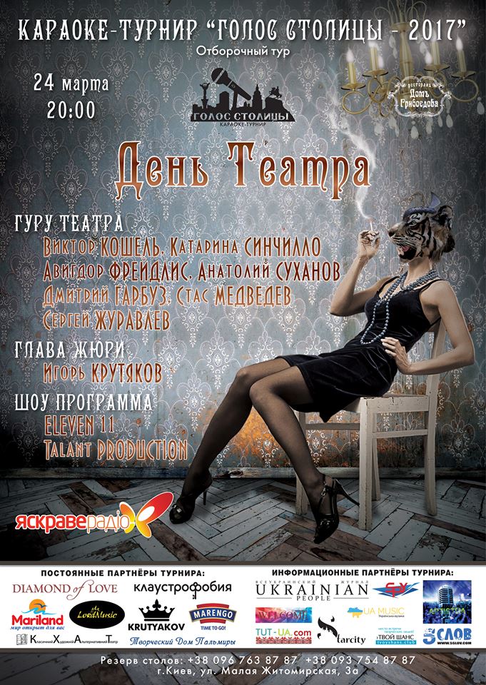 24 марта состоится отбор месяца караоке-турнира «Голос Столицы». Уже по традиции своей душевной атмосферой посетителей и участников отбора принимает караоке-ресторан «Домъ Грибоедова». В период сбора гостей вам совершенно не придется скучать. Дуэт «Eleven 11 Music Project», виртуозно играющие на бандуре и аккордеоне, зададут вечеру хороший старт.
