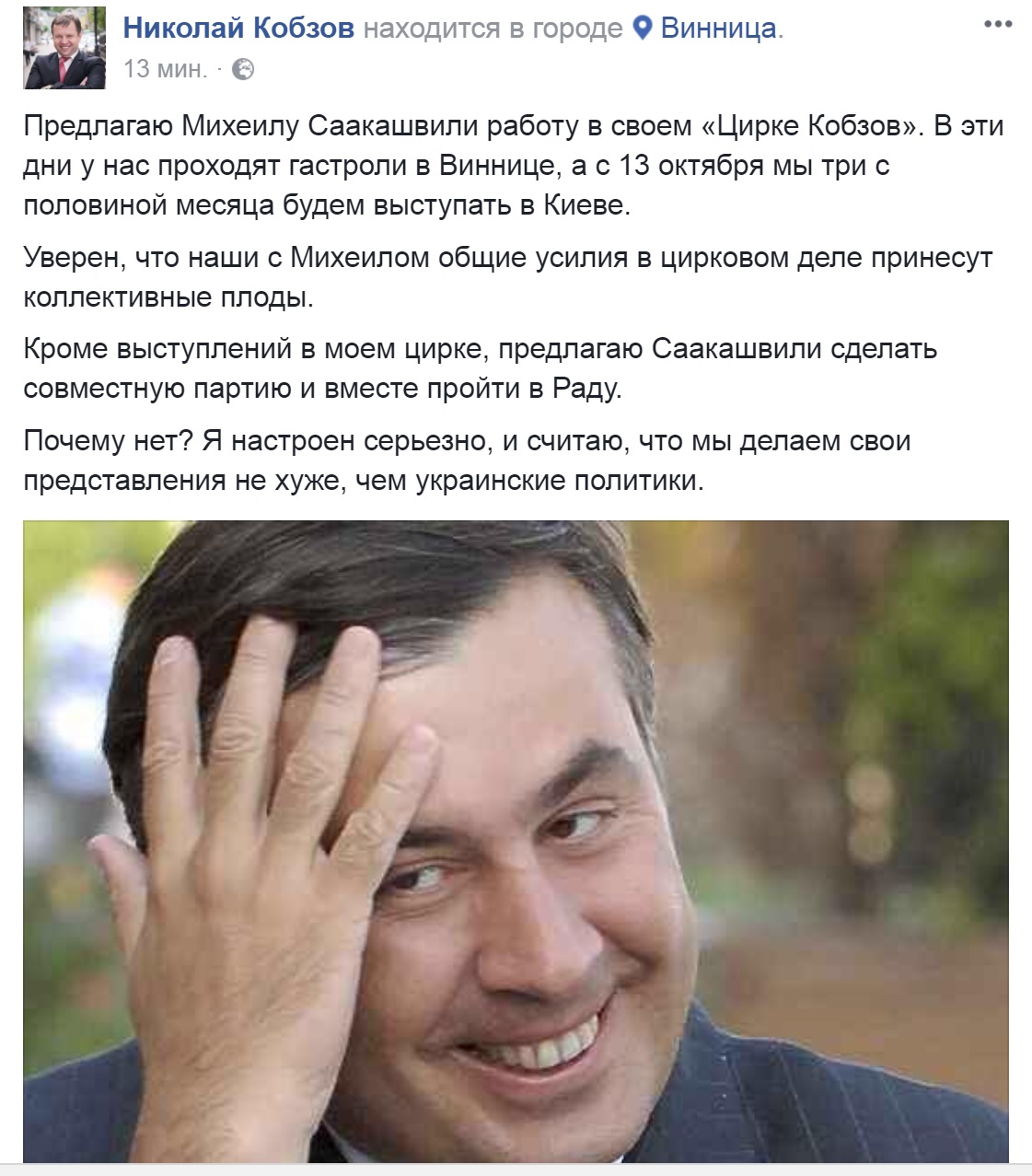 Шоу с Саакашвили набирает обороты. Так известный цирковой деятель Николай Кобзов разместил неординарный текст на своей странице в социальной сети, где предложил Михеилу Саакашвили работу в своем цирке и сделать совместную партию и вместе пройти в Раду.