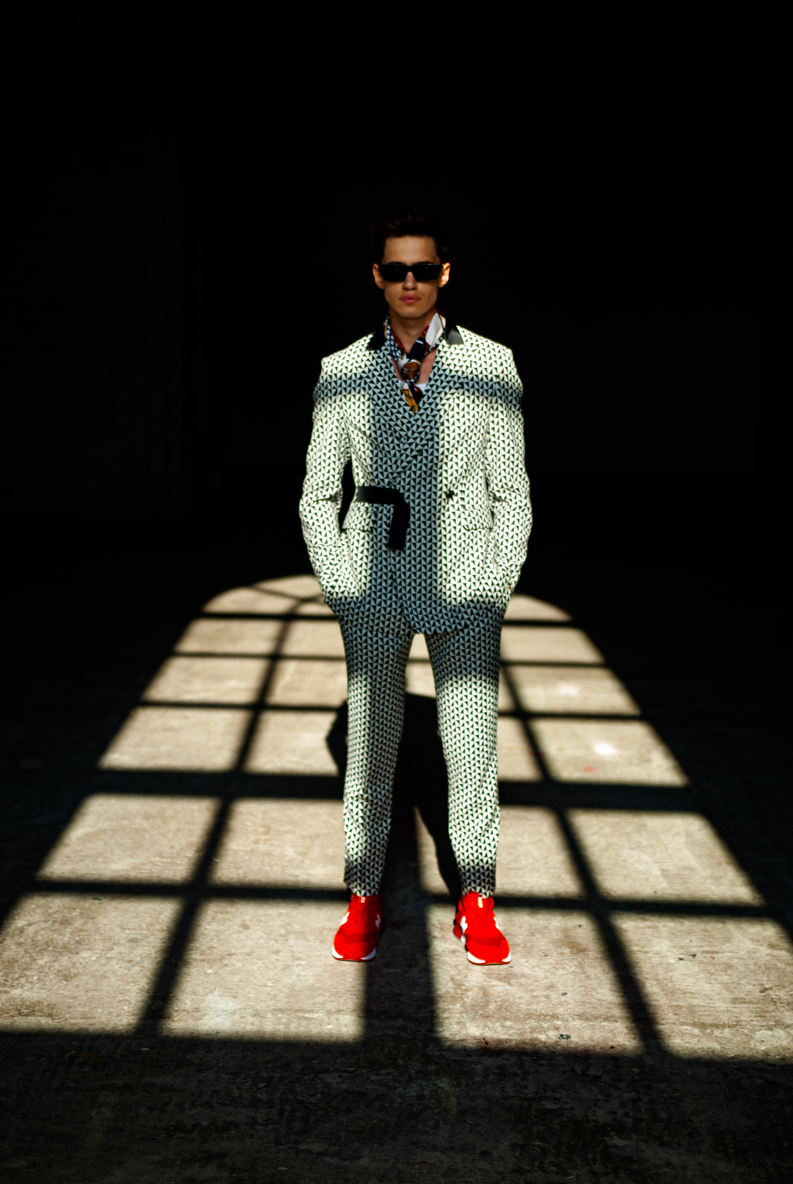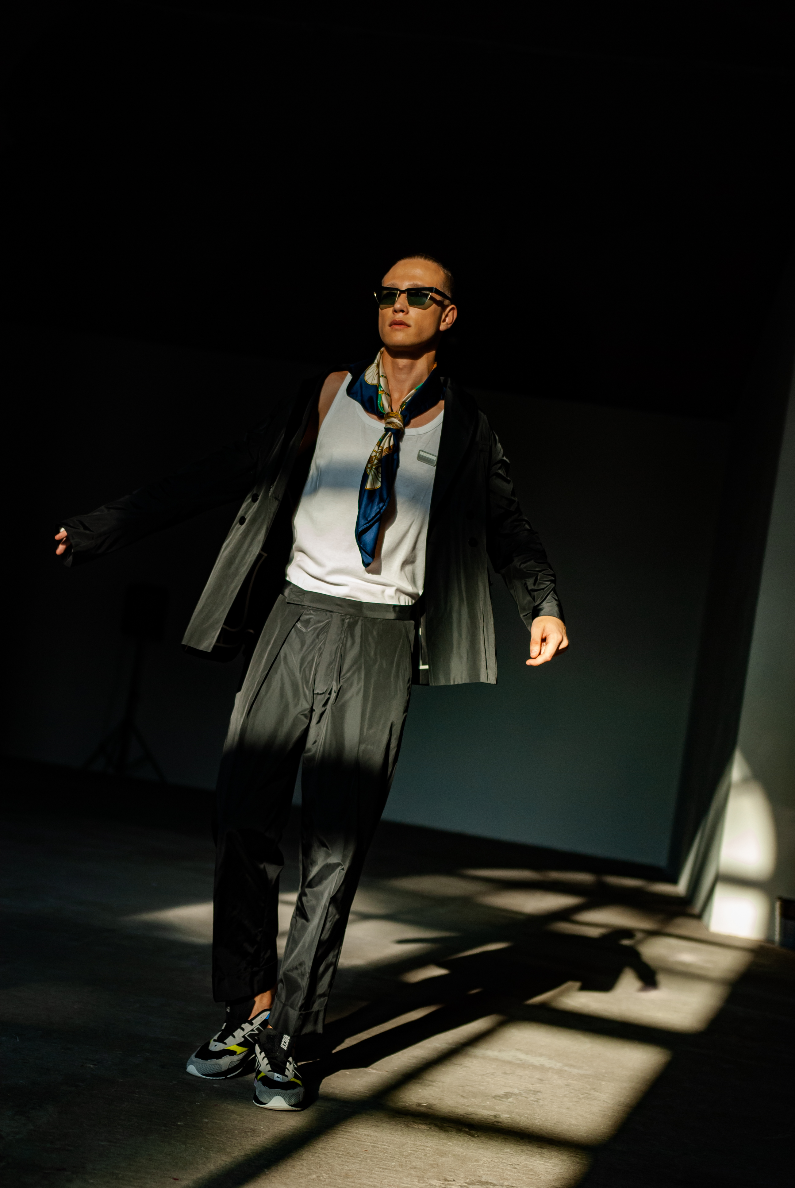 Играя с цветовыми решениями, дизайнер придерживался строгой и холодной гаммы – универсальных черного, серого и синего. Но именно яркие акценты в виде красного, фиолетового и черно-белого футуристического принта задают настроение коллекции. Также Серж Смолин придал особое значение деталям, используя паты на пиджаках и застёжки на липучках, соединяя их с манжетами и высокими разрезами на брюках.