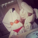 А вот Аня Седакова скорее всего делала свой костюм на скорую руку в последнюю минуту. Как в детском лагере она одела на себя простынь, добавив к исконно приведенческому наряду нижнее белье, чем стала уже похожа на героинь восточных сказок. И не разберешь теперь кто с этих двух красавиц Аня.